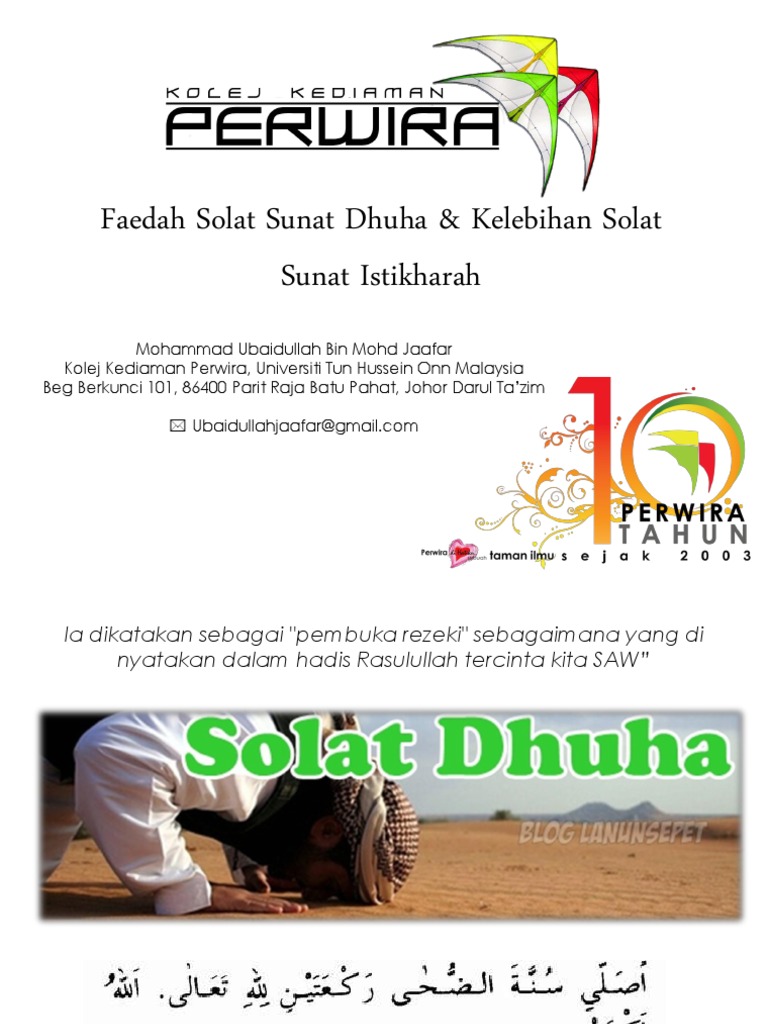 Antara kelebihan solat dhuha yang lain adalah dua rakaat solat dhuha menyamai kita telah melaksanakan sedekah terhadap 360 sendi di dalam badan kita. Paras ini merupakan paras seseorang dapat berhubung dengan minda bawah sedar dengan aktif. Walaupun kerja di rumah tak pernah putus, kita sebagai surirumah seharusnya tidak terlepas daripada merebut peluang menunaikan solat sunat dhuha pada setiap pagi. Solat sunat dhuha dilakukan pada waktu matahari sedang naik. 30 likes · 12 talking about this.